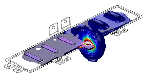 The simulation shows the areas in and around the busbar with a high magnetic flux (values in µT, as probe current is only 1 A). It can be observed that the highest magnetic flux, thus the largest contribution to the inductance is found in the connection terminal of the IGBT. The second largest contributors are the capacitor connections.